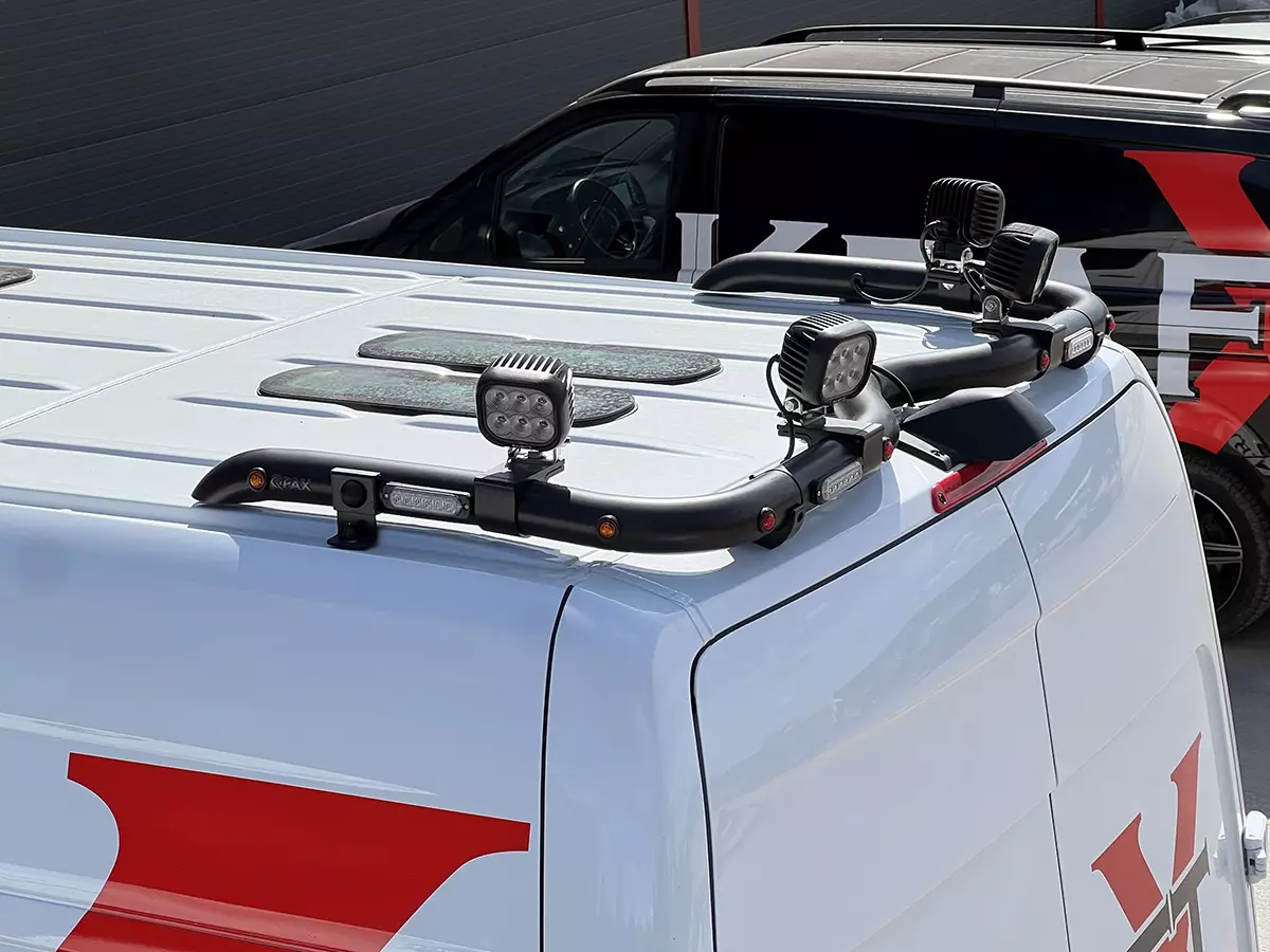 Utrusta din Mercedes Sprinter med T-RACK bakre takbåge – en robust och smart lösning för montering av arbetsbelysning och blixtljus. Denna modell är särskilt anpassad för Sprinter H2 från 2018 och framåt med takmonterad kamera, vilket säkerställer optimal passform utan att störa bilens funktioner.